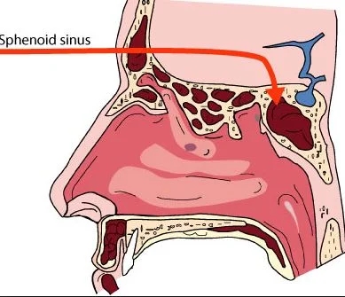The pictures above show the sphenoid sinus in a diagram and on CT. Sphenoid mucoceles can cause compression of the pituitary.