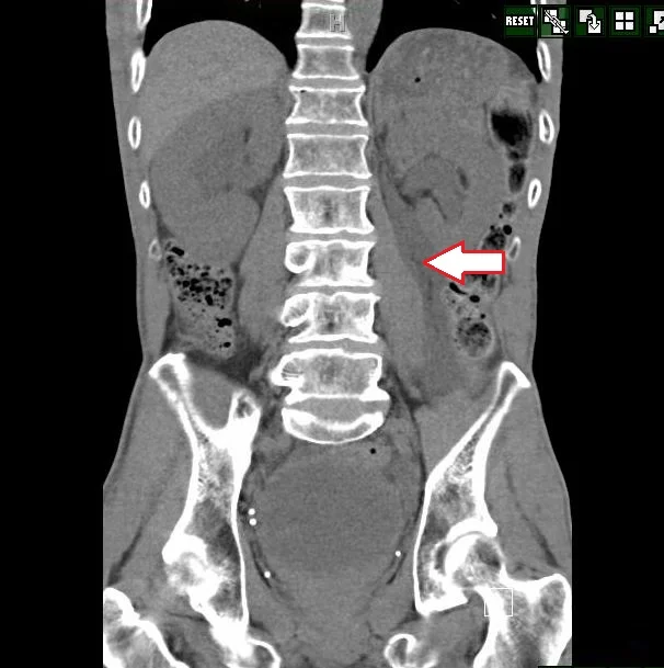 A 64 y.o. diabetic presents with L flank pain and elevated blood sugar. His CT is below.
