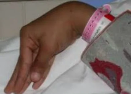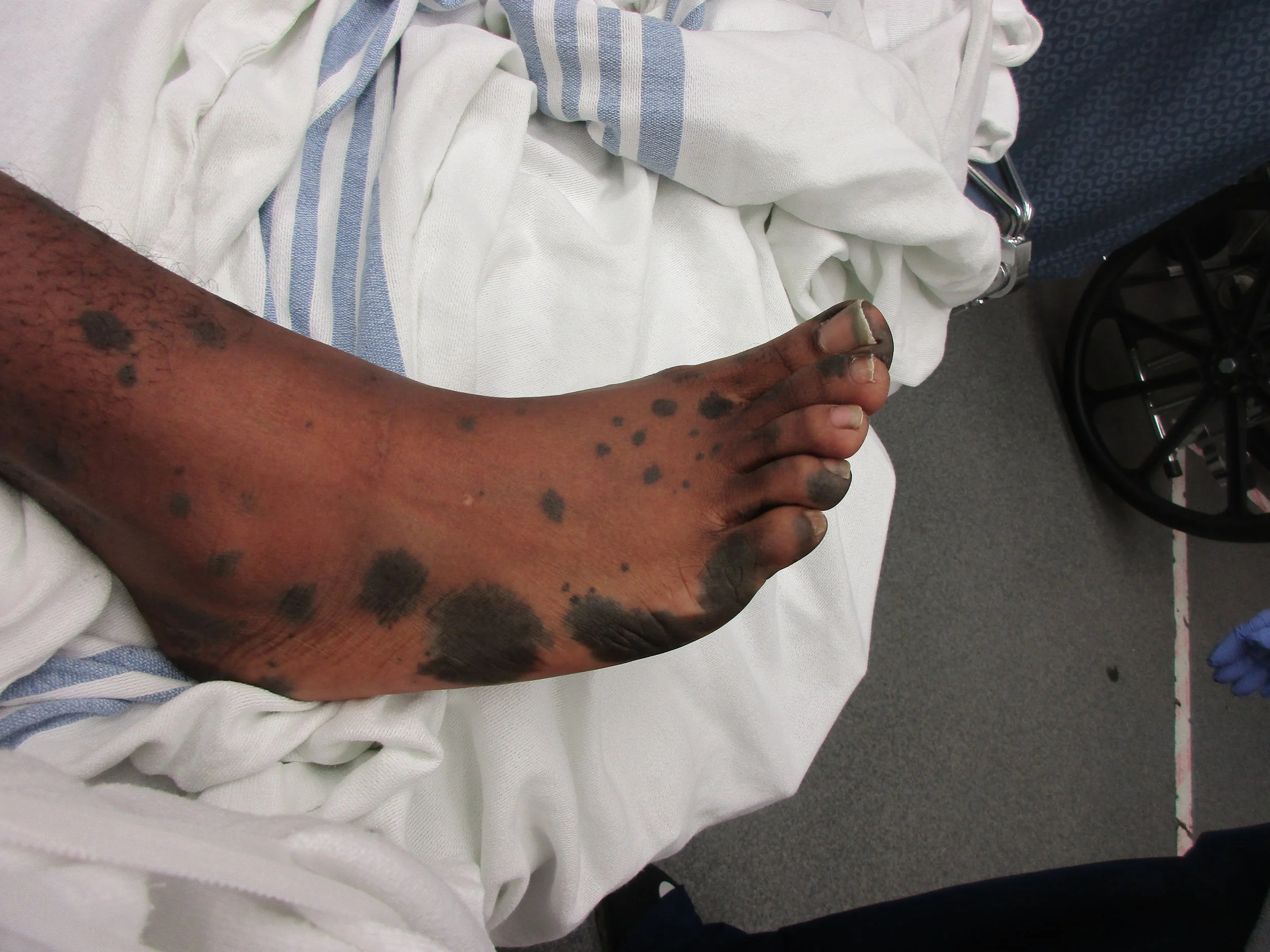 A 23 y.o, presents to the ED with carpopedal spasms, you notice something unusual on exam of his skin.