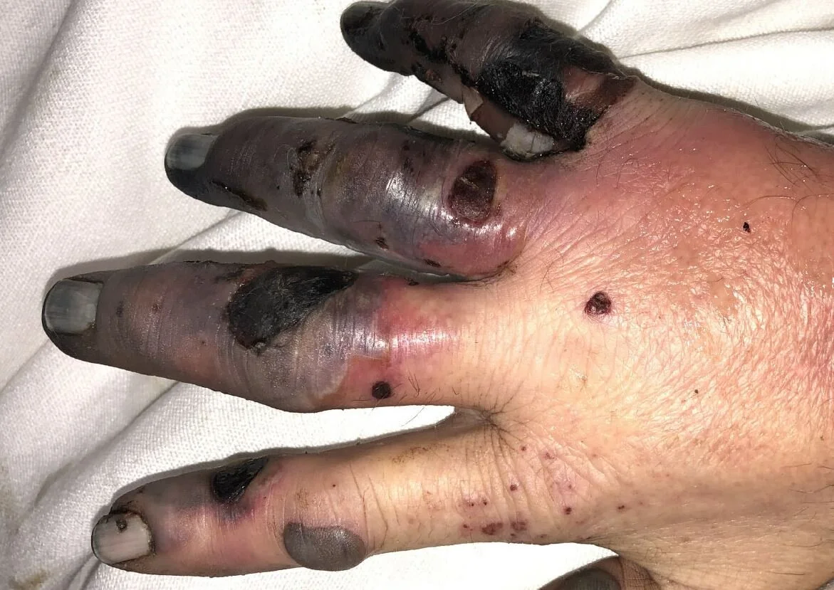 In the case of our patient the cause of the Sweet’s has not been determined but hep C and cocaine are both noted to cause it. He developed the rash on his chest prior to falling on the floor. The necrosis of the hand was thought due to vasculitis probably from toxic products released from neutrophils and aggravated by lying on the hand five days. The lesions on the chest were characteristic of Sweet’s syndrome and responded to steroids. Plastics is following the necrotic fingers and partial amputations are planned. The pt initially had blood cultures + for MSSA and strep mitis. His TEE was negative for any source of emboli.