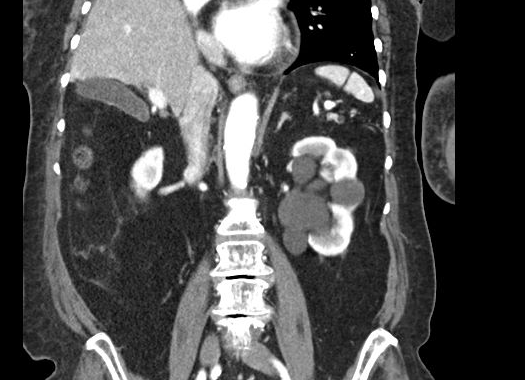 Our patient had a multicystic lesion in the head of the pancreas suggestive of a serous cystic neoplasm. She also had multiple cystic pancreatic tail lesions thought to represent intraductal papillary neoplasms. In addition, she had a renal sinus cyst on the left which can mimic hydronephrosis.