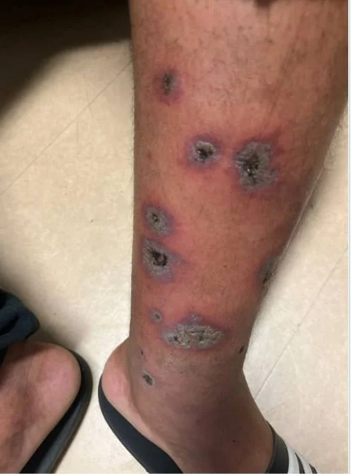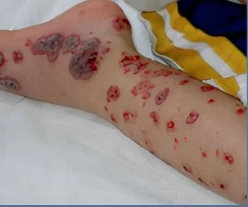 A 22 y.o. comes in with a rash; it began 3 weeks ago as papules and now has become necrotic.