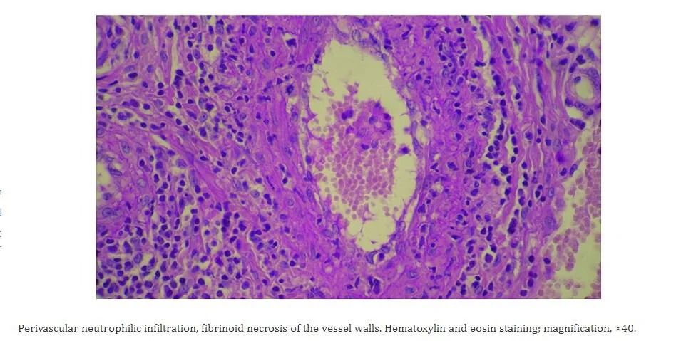 Our patient had leukocytoclastic vasculitis. This is a small vessel vasculitis mediated by immune complexes in the dermal capillaries and venules. These complexes recruit neutrophils by attaching to the Fcy receptors on neutrophils. The neutrophils then attach to vessel walls and cause necrosis (caused by lysosomal enzymes and free radicals) allowing the neutrophils to move into the surrounding tissue.