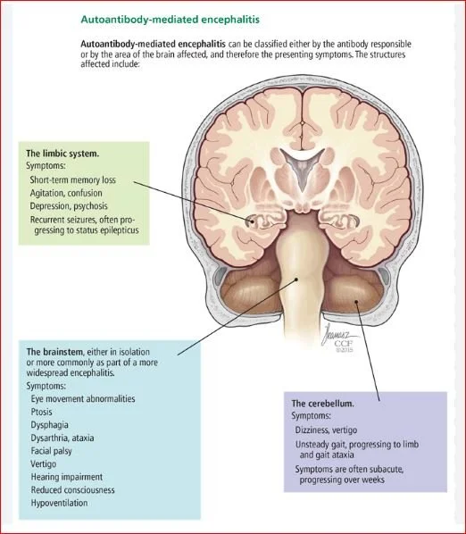 Neural antibody associated encephalitis has been reported after vaccination for influenza and MMR. It can also be triggered by herpes virus. The disease occurs on a spectrum with the most severe cases causing coma and a 3-4 month hospitalization, while other patients have only personality changes. While NMDA is the most common neural receptor associated with encephalitis, GABA-R (gamma –aminobutyric acid-B receptors ,AMPAR( isoxazolepropionic acid receptors) and LGH (leucine-rich glioma-inactivated 1) receptor antibodies also cause encephalitis. In these cases limbic areas of the brain; the hippocampus and amygdala, produse abnormalities of emotion and memory.