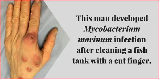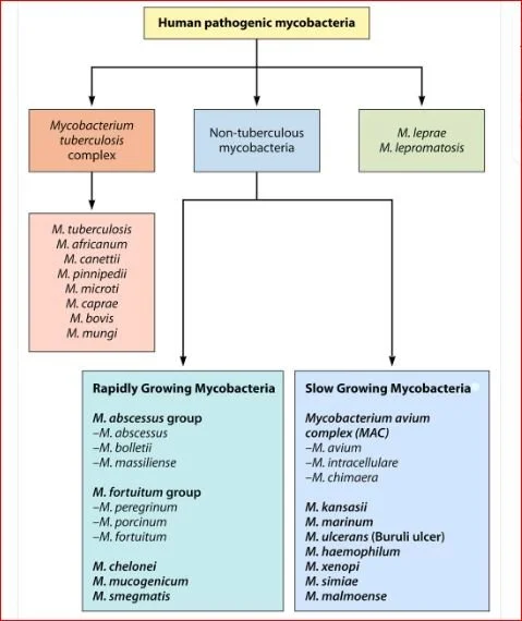 1. Non-tuberculous mycobacteria are divided into rapidly growing and slow growing. The rapidly growing like M. abscessus are associated with plastic surgery procedures and are thought to be from contaminated instruments. Lesions have been reported after acupuncture. The slow growing mycobacteria include MAC(mycobacterium avium complex) is the most common cause of mycobacterial infection which is not tuberculosis. It can affect both lungs and skin. Mycobacterium marinum is also in this group. It is found in a water environment and can cause chronic ulcers after a break in the skin.