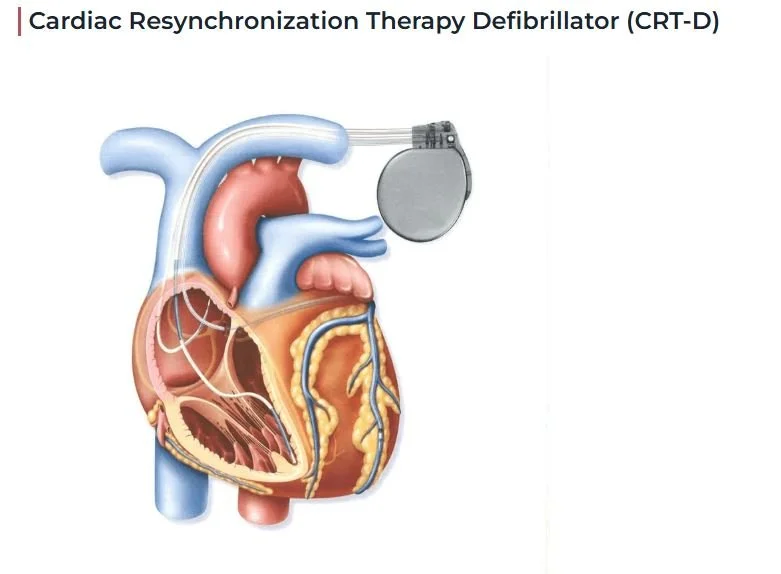 Three leads are implanted in the heart. A Right atrial lead helps the device monitor the upper heart chambers allowing for the timing of ventricular pacing. A right ventricular lead paces the RV. A third lead is threaded into the L coronary sinus overlying the left ventricle. This lead enables coordination between the two ventricles.