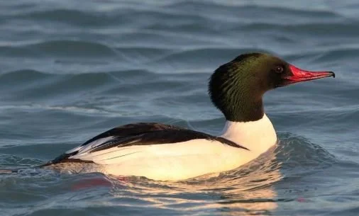 The merganser is not a mallard: it has a long narrow red beak with serrated edges to catch fish.