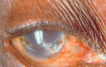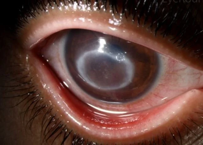 While the original ED exam was thorough; the diagnosis was missed because a slit lamp exam was not performed. Edema initially causes the cornea to have a dull appearance. As the edema persists, the cornea may develop microcysts , bullae and scarring. If untreated a cornea transplant could be necessary.