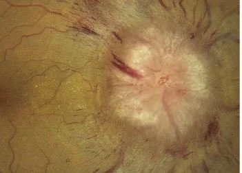 Our patient had intracranial hypertension with signs of increased intracranial pressure but without a mass or hydrocephalus Her scan shows papilledema with bulging of the optic nerves into the vitreous and dilated dural sheaths.