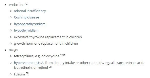 One of the more interesting causes of secondary intracranial hypertension is an elongated styloid process or calcifies stylohyoid ligament which obstructs the jugular outside of the skull. A picture is shown below. The treatment for this is surgery.