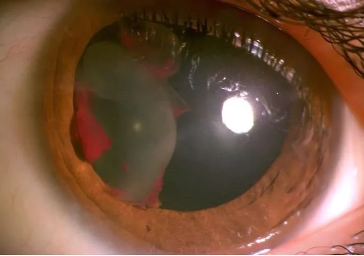 Our patient had a traumatic cataract. Traumatic cataracts are common after blunt eye injury. Up to 65% of eye traumas lead to traumatic cataracts. Occasionally, the lens may appear cloudy in a rosette fashion as in our patient. Traumatic cataracts can occur suddenly or over time. Cataracts developing after a lightning strike are often delayed months. Cataracts can be caused by exposure to laser light which can be absorbed by and damage the lens.